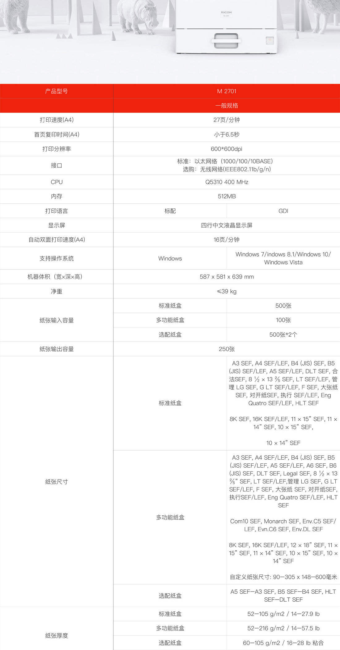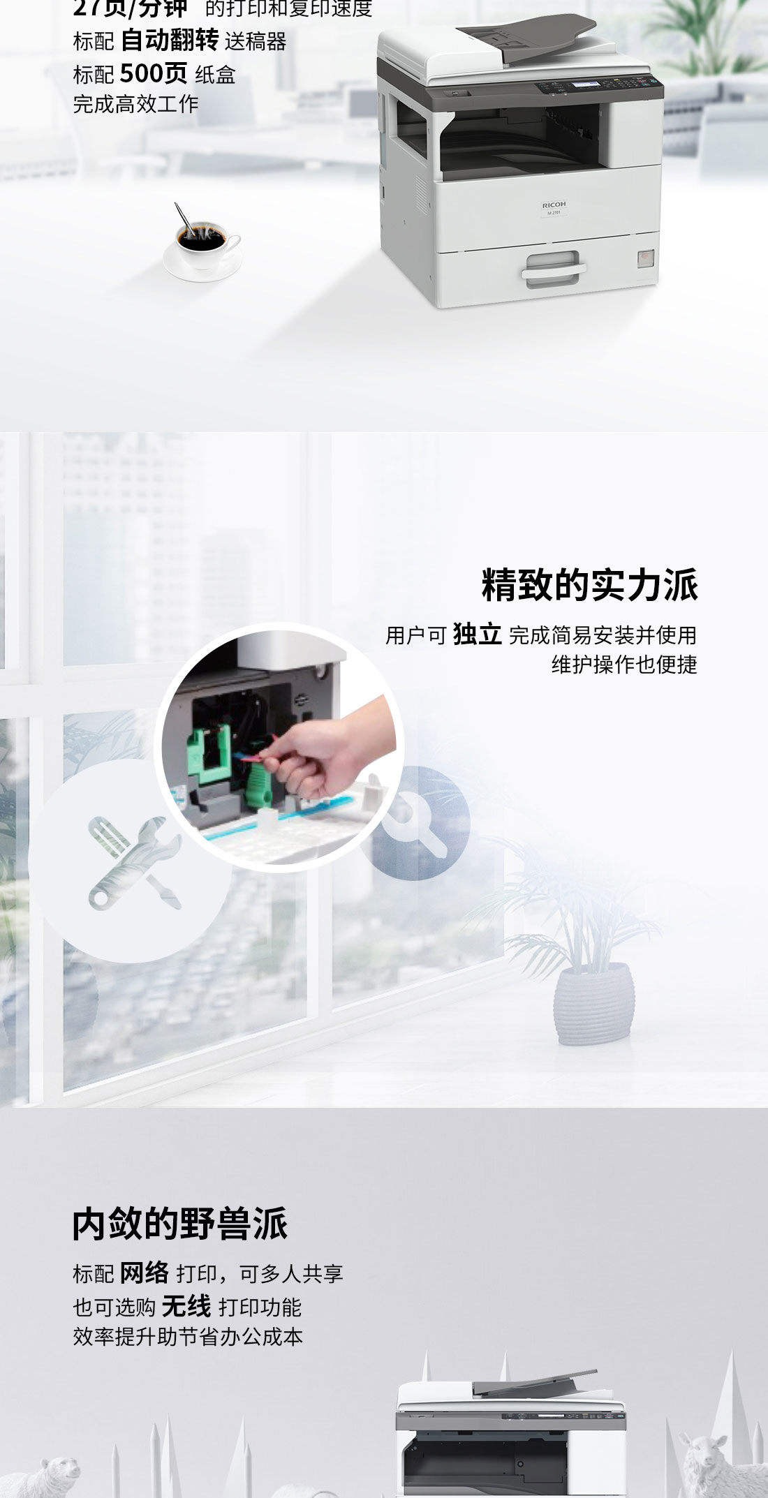理光RicohM2701A3黑白数码复合机主机送稿器单纸盒无线